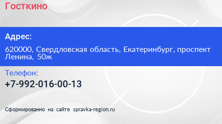 Госткино по адресу 620000, Свердловская область, Екатеринбург, проспект Ленина, 50ж в дальнейшем Организация, размещена в следующих категориях: