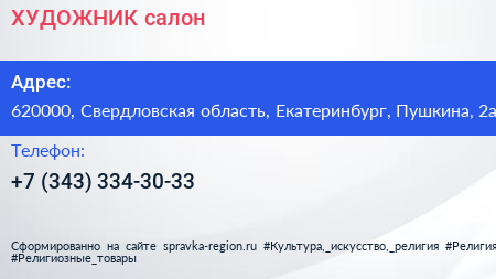 ХУДОЖНИК, салон по адресу 620000, Свердловская область, Екатеринбург, Пушкина, 2а в дальнейшем Организация, размещена в следующих категориях: