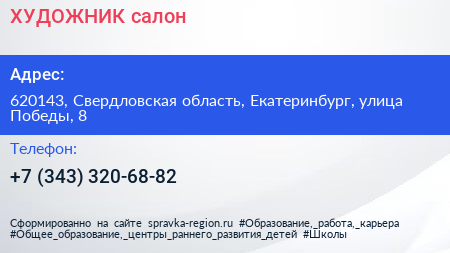 ХУДОЖНИК, салон по адресу 620143, Свердловская область, Екатеринбург, улица Победы, 8 в дальнейшем Организация, размещена в следующих категориях: