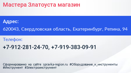 Мастера Златоуста, магазин по адресу 620043, Свердловская область, Екатеринбург, Репина, 94 в дальнейшем Организация, размещена в следующих категориях: