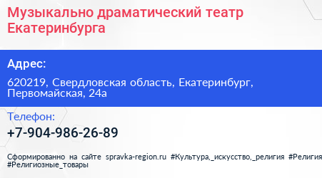 Музыкально-драматический театр Екатеринбурга по адресу 620219, Свердловская область, Екатеринбург, Первомайская, 24а в дальнейшем Организация, размещена в следующих категориях: