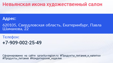 Невьянская икона, художественный салон по адресу 620105, Свердловская область, Екатеринбург, Павла Шаманова, 22 в дальнейшем Организация, размещена в следующих категориях: