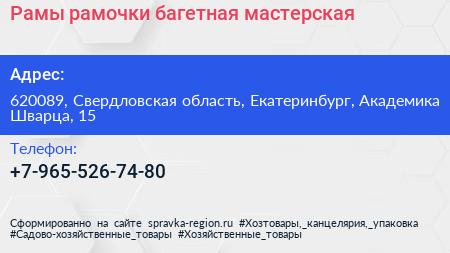 Рамы-рамочки, багетная мастерская по адресу 620089, Свердловская область, Екатеринбург, Академика Шварца, 15 в дальнейшем Организация, размещена в следующих категориях: