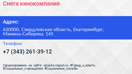 Снега, кинокомпания по адресу 620000, Свердловская область, Екатеринбург, Мамина-Сибиряка, 145 в дальнейшем Организация, размещена в следующих категориях: