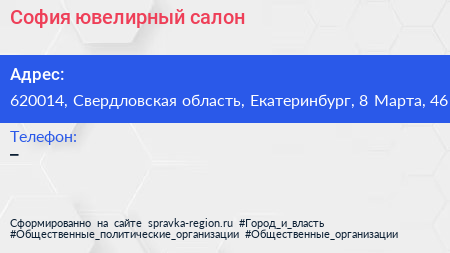 София, ювелирный салон по адресу 620014, Свердловская область, Екатеринбург, 8 Марта, 46 в дальнейшем Организация, размещена в следующих категориях: