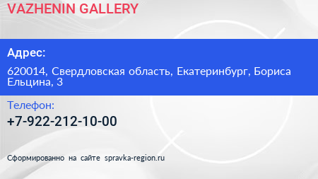 VAZHENIN GALLERY по адресу 620014, Свердловская область, Екатеринбург, Бориса Ельцина, 3 в дальнейшем Организация, размещена в следующих категориях: