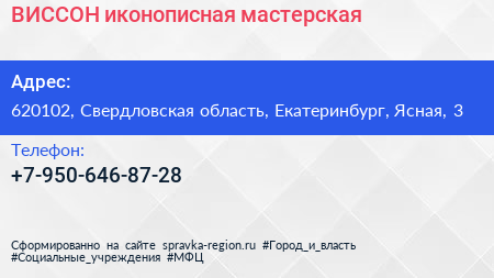ВИССОН, иконописная мастерская по адресу 620102, Свердловская область, Екатеринбург, Ясная, 3 в дальнейшем Организация, размещена в следующих категориях: