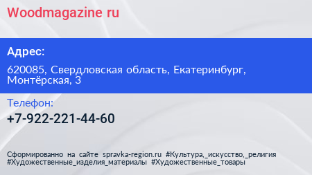 Woodmagazine.ru по адресу 620085, Свердловская область, Екатеринбург, Монтёрская, 3 в дальнейшем Организация, размещена в следующих категориях: