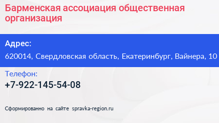 Барменская ассоциация, общественная организация по адресу 620014, Свердловская область, Екатеринбург, Вайнера, 10 в дальнейшем Организация, размещена в следующих категориях: