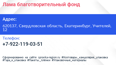 Лама, благотворительный фонд по адресу 620137, Свердловская область, Екатеринбург, Учителей, 12 в дальнейшем Организация, размещена в следующих категориях: