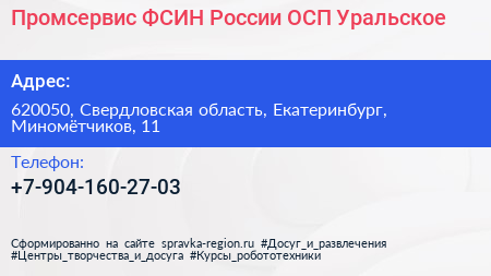 Промсервис, ФСИН России ОСП Уральское по адресу 620050, Свердловская область, Екатеринбург, Миномётчиков, 11 в дальнейшем Организация, размещена в следующих категориях: