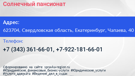 Солнечный, пансионат по адресу 623704, Свердловская область, Екатеринбург, Чапаева, 40 в дальнейшем Организация, размещена в следующих категориях:
