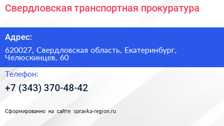 Свердловская транспортная прокуратура по адресу 620027, Свердловская область, Екатеринбург, Челюскинцев, 60 в дальнейшем Организация, размещена в следующих категориях: