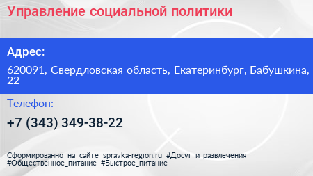 Управление социальной политики по адресу 620091, Свердловская область, Екатеринбург, Бабушкина, 22 в дальнейшем Организация, размещена в следующих категориях: