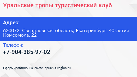 Уральские тропы, туристический клуб по адресу 620072, Свердловская область, Екатеринбург, 40-летия Комсомола, 22 в дальнейшем Организация, размещена в следующих категориях:
