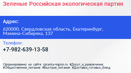 Зеленые, Российская экологическая партия по адресу 620000, Свердловская область, Екатеринбург, Мамина-Сибиряка, 137 в дальнейшем Организация, размещена в следующих категориях: