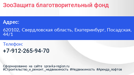 ЗооЗащита, благотворительный фонд по адресу 620102, Свердловская область, Екатеринбург, Посадская, 44/1 в дальнейшем Организация, размещена в следующих категориях: