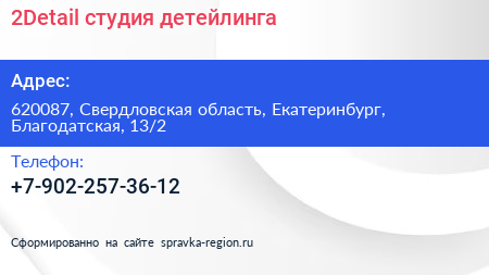 2Detail, студия детейлинга по адресу 620087, Свердловская область, Екатеринбург, Благодатская, 13/2 в дальнейшем Организация, размещена в следующих категориях: