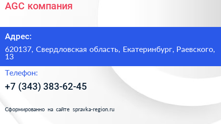 AGC, компания по адресу 620137, Свердловская область, Екатеринбург, Раевского, 13 в дальнейшем Организация, размещена в следующих категориях: