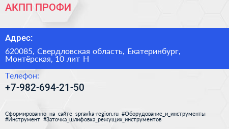 АКПП-ПРОФИ по адресу 620085, Свердловская область, Екатеринбург, Монтёрская, 10 лит Н в дальнейшем Организация, размещена в следующих категориях: