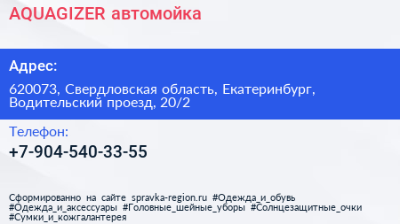 AQUAGIZER, автомойка по адресу 620073, Свердловская область, Екатеринбург, Водительский проезд, 20/2 в дальнейшем Организация, размещена в следующих категориях: