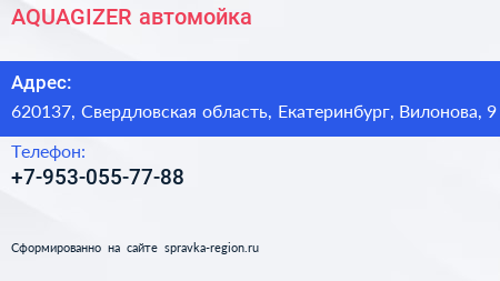 AQUAGIZER, автомойка по адресу 620137, Свердловская область, Екатеринбург, Вилонова, 9 в дальнейшем Организация, размещена в следующих категориях: