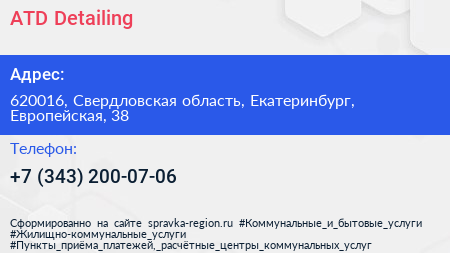 ATD Detailing по адресу 620016, Свердловская область, Екатеринбург, Европейская, 38 в дальнейшем Организация, размещена в следующих категориях:
