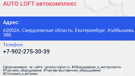 AUTO LOFT, автокомплекс по адресу 620026, Свердловская область, Екатеринбург, Куйбышева, 38Б в дальнейшем Организация, размещена в следующих категориях: