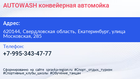 AUTOWASH, конвейерная автомойка по адресу 620144, Свердловская область, Екатеринбург, улица Московская, 285 в дальнейшем Организация, размещена в следующих категориях: