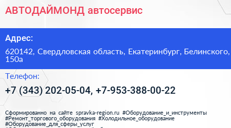 АВТОДАЙМОНД, автосервис по адресу 620142, Свердловская область, Екатеринбург, Белинского, 150а в дальнейшем Организация, размещена в следующих категориях: