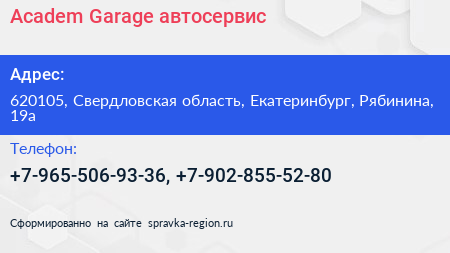 Academ Garage, автосервис по адресу 620105, Свердловская область, Екатеринбург, Рябинина, 19а в дальнейшем Организация, размещена в следующих категориях: