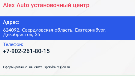 Alex Auto, установочный центр по адресу 624092, Свердловская область, Екатеринбург, Декабристов, 35 в дальнейшем Организация, размещена в следующих категориях:
