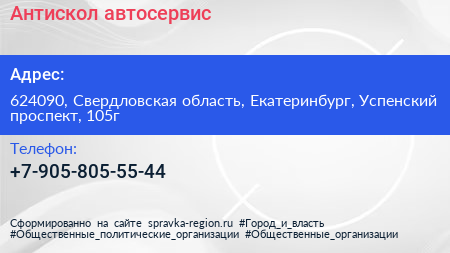 Антискол, автосервис по адресу 624090, Свердловская область, Екатеринбург, Успенский проспект, 105г в дальнейшем Организация, размещена в следующих категориях: