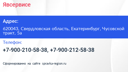 #Явсервисе по адресу 620043, Свердловская область, Екатеринбург, Чусовской тракт, 5а в дальнейшем Организация, размещена в следующих категориях: