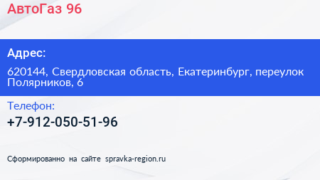 АвтоГаз 96 по адресу 620144, Свердловская область, Екатеринбург, переулок Полярников, 6 в дальнейшем Организация, размещена в следующих категориях:
