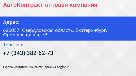 АвтоКонтракт, оптовая компания по адресу 620057, Свердловская область, Екатеринбург, Фрезеровщиков, 79 в дальнейшем Организация, размещена в следующих категориях: