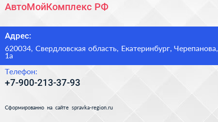 АвтоМойКомплекс.РФ по адресу 620034, Свердловская область, Екатеринбург, Черепанова, 1а в дальнейшем Организация, размещена в следующих категориях: