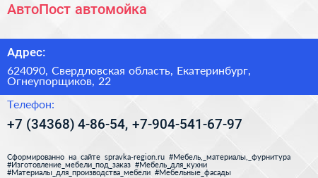 АвтоПост, автомойка по адресу 624090, Свердловская область, Екатеринбург, Огнеупорщиков, 22 в дальнейшем Организация, размещена в следующих категориях: