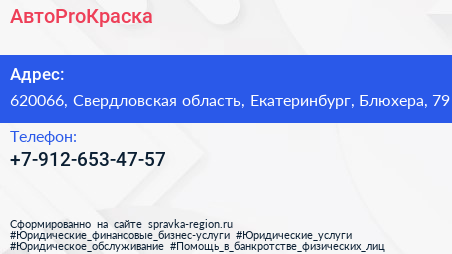 АвтоProКраска по адресу 620066, Свердловская область, Екатеринбург, Блюхера, 79 в дальнейшем Организация, размещена в следующих категориях: