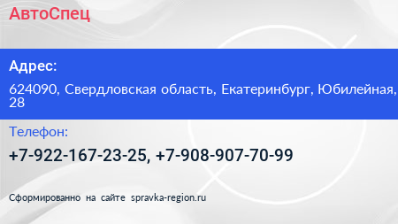 АвтоСпец по адресу 624090, Свердловская область, Екатеринбург, Юбилейная, 28 в дальнейшем Организация, размещена в следующих категориях:
