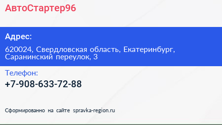 АвтоСтартер96 по адресу 620024, Свердловская область, Екатеринбург, Саранинский переулок, 3 в дальнейшем Организация, размещена в следующих категориях: