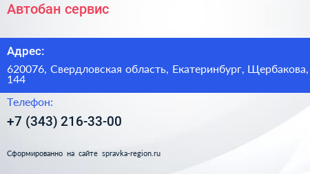 Автобан, сервис по адресу 620076, Свердловская область, Екатеринбург, Щербакова, 144 в дальнейшем Организация, размещена в следующих категориях: