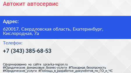 Автокит, автосервис по адресу 620017, Свердловская область, Екатеринбург, Кислородная, 7а в дальнейшем Организация, размещена в следующих категориях: