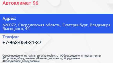 Автоклимат 96 по адресу 620072, Свердловская область, Екатеринбург, Владимира Высоцкого, 44 в дальнейшем Организация, размещена в следующих категориях: