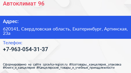 Автоклимат 96 по адресу 620141, Свердловская область, Екатеринбург, Артинская, 23а в дальнейшем Организация, размещена в следующих категориях: