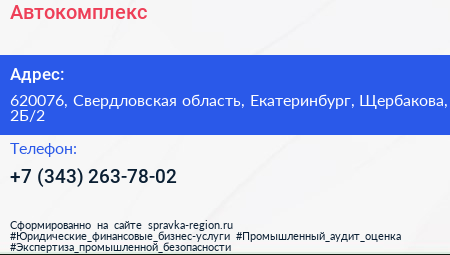 Автокомплекс по адресу 620076, Свердловская область, Екатеринбург, Щербакова, 2Б/2 в дальнейшем Организация, размещена в следующих категориях:
