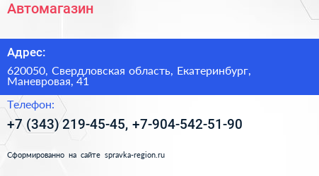 Автомагазин по адресу 620050, Свердловская область, Екатеринбург, Маневровая, 41 в дальнейшем Организация, размещена в следующих категориях: