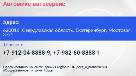 Автомикс, автосервис по адресу 620016, Свердловская область, Екатеринбург, Мостовая, 37/1 в дальнейшем Организация, размещена в следующих категориях: