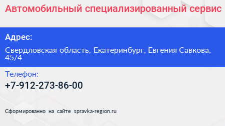 Автомобильный специализированный сервис по адресу Свердловская область, Екатеринбург, Евгения Савкова, 45/4 в дальнейшем Организация, размещена в следующих категориях: