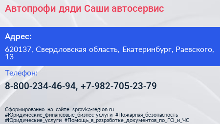 Автопрофи дяди Саши, автосервис по адресу 620137, Свердловская область, Екатеринбург, Раевского, 13 в дальнейшем Организация, размещена в следующих категориях: